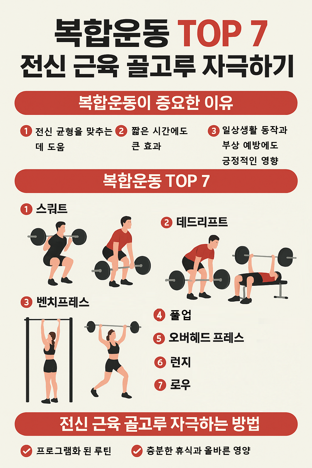 지금까지 복합운동 TOP 7, 전신 근육 골고루 자극하기라는 주제로 스쿼트, 데드리프트, 벤치프레스, 풀업, 오버헤드 프레스, 런지, 로우를 살펴봤습니다. 이 일곱 가지 운동은 전신 근육을 균형 있게 발달시키고, 시간 대비 최고의 운동 효과를 제공합니다.